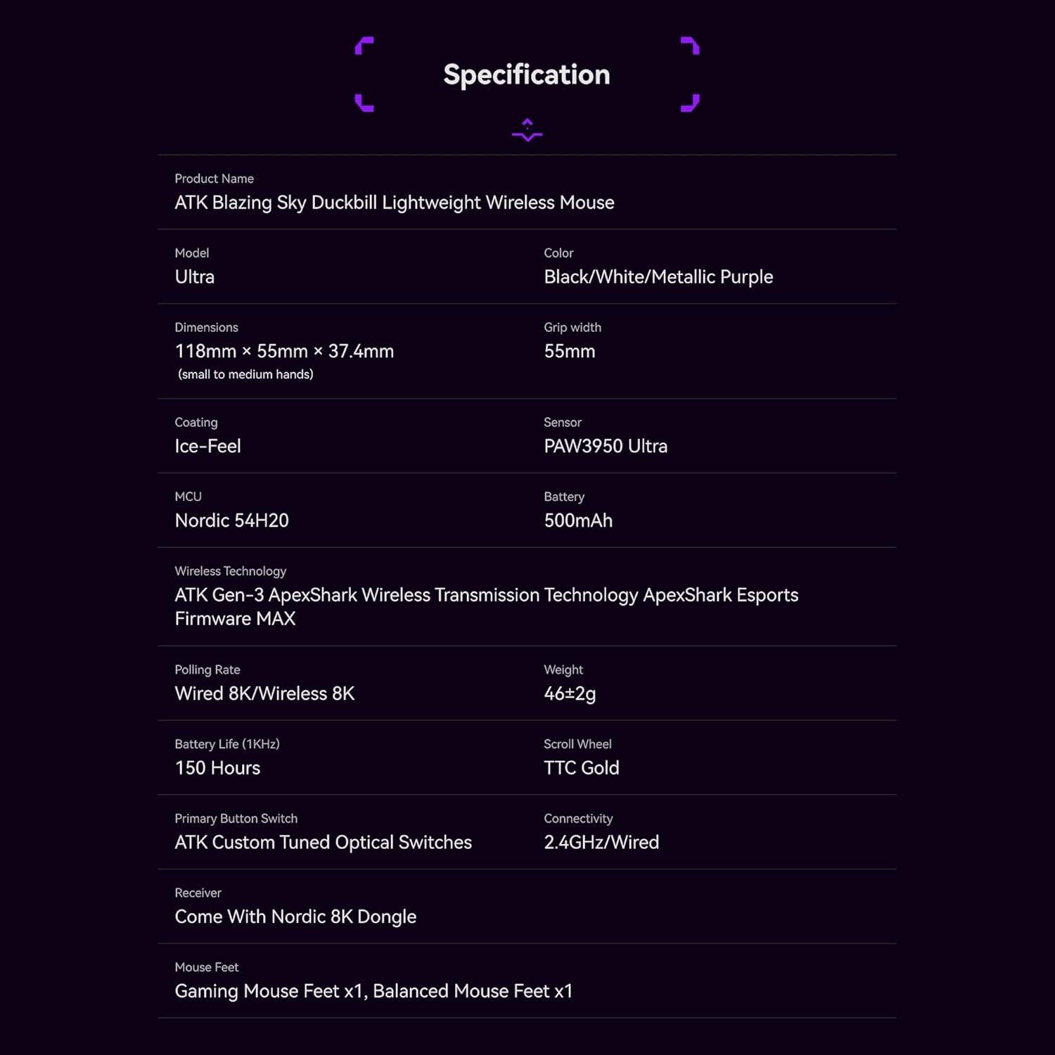 - Wireless Technology : ATK Gen-3 ApexShark Wireless Transmission Technology ApexShark Esports Firmware MAX